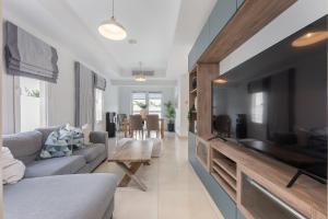 This air-conditioned villa features three separate bedrooms with four beds in total across them. There are three private bathrooms ensuring convenience for all guests staying on site. The fully equipped kitchen comes with cooking facilities as well as storage options to prepare meals comfortably during your stay. Additional room amenities include ironing facilities with an iron and ironing board, a washing machine for laundry needs, air conditioning throughout the villa, a baby cot or crib upon request for young children’s comfort as well as television entertainment.