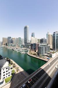 Ubicado en el distrito Dubai Marina de Dubái, este impresionante apartamento de 1 dormitorio con vistas impresionantes a Dubai Marina ofrece vistas al lago y a la ciudad. Esta amplia vivienda incluye un balcón con vista al agua, estacionamiento privado y WiFi gratuito.