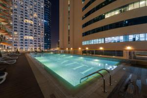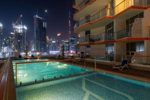 Apartmán Stunning Waterfront Burj Views with Pool & Gym, Sleeps 6 se nachází v Dubaji a nabízí soukromý bazén a fitness centrum. Tento klimatizovaný a prostorný apartmán zahrnuje jednu ložnici a z terasy je výhled na jezero. Hosté mohou během pobytu využívat bezplatné soukromé parkování a WiFi zdarma.