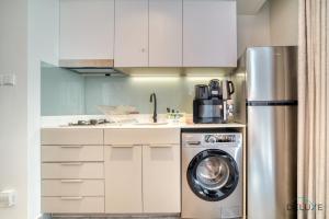 El estudio dispone de cocina americana totalmente equipada con horno, placa vitrocerámica, frigorífico, microondas, tostadora, cafetera, hervidor eléctrico y utensilios de cocina. En el interior hay una cama junto con aire acondicionado, lavadora y sofá. El baño privado incluye ducha, bidé y artículos de aseo gratuitos como champú, acondicionador y jabón corporal. Entre las comodidades adicionales se encuentran caja fuerte, armario/ropero, plancha, tendedero para ropa y cuna para bebé.