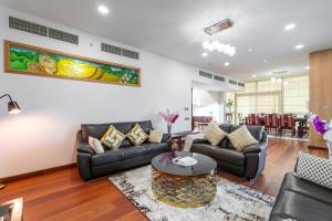 Accommodation comprises four separate bedrooms, four bathrooms each equipped with complimentary toiletries and showers, as well as a fully equipped kitchen featuring a stovetop, refrigerator, microwave, electric kettle and dining table. Additional in-room amenities include air conditioning, an iron, wardrobe or closet space, work desk seating area with sofa and flat-screen TV alongside towels and bed linen.