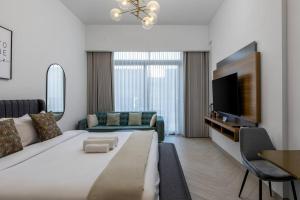 Waves - Elegant Oxford 212 Kawalerka w JVC z widokiem na miasto oferuje klimatyzowane zakwaterowanie z prywatnym basenem i widokiem na panoramę Dubaju. Apartament składa się z jednego pokoju i zapewnia bezpłatny prywatny parking oraz wygodny dostęp windą, co czyni go praktycznym wyborem dla gości.